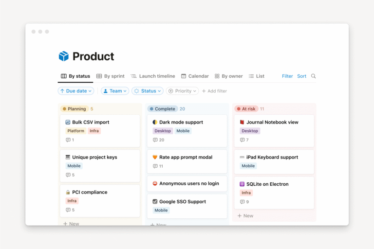 Notion est une application de productivité qui se distingue par sa flexibilité exceptionnelle. Elle permet de créer des pages personnalisables à l’infini, mêlant textes, tableaux, bases de données, listes de tâches, calendriers, kanban et bien plus encore. Cette modularité en fait un outil adapté aussi bien à un usage personnel (gestion de projets, journal, suivi d’habitudes) qu’à un usage professionnel (CRM, gestion d’équipe, suivi de tâches, documentation produit…).